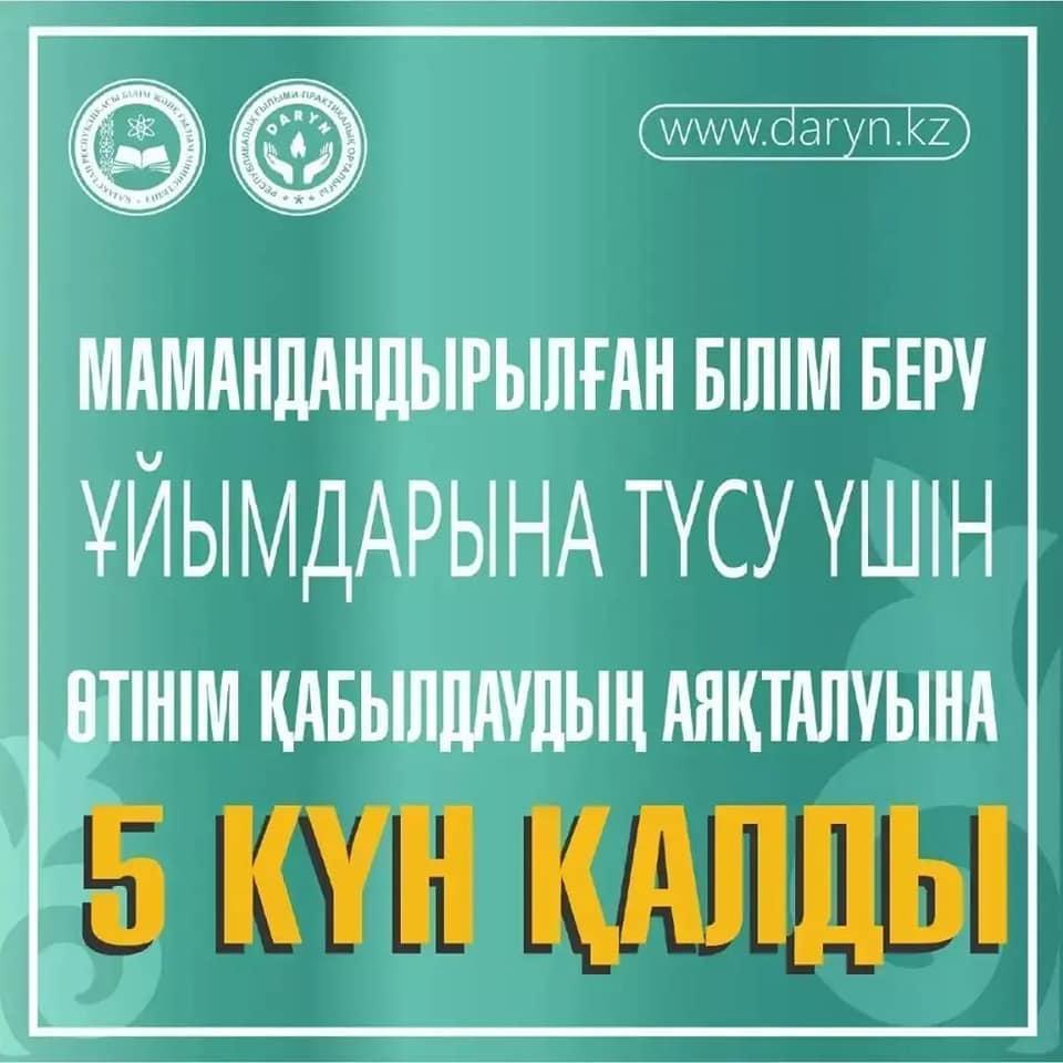 Құрметті ата-аналар! Еліміздің барлық өңірінде дарынды балаларға арналған мамандандырылған білім беру ұйымдарына түсуге өтініштер қабылдаудың аяқталуына 5 күн қалғанын хабарлаймыз. Оқушылар арасында конкурстық іріктеу 2022-2023 оқу жылына түсу үшін өткізіледі.