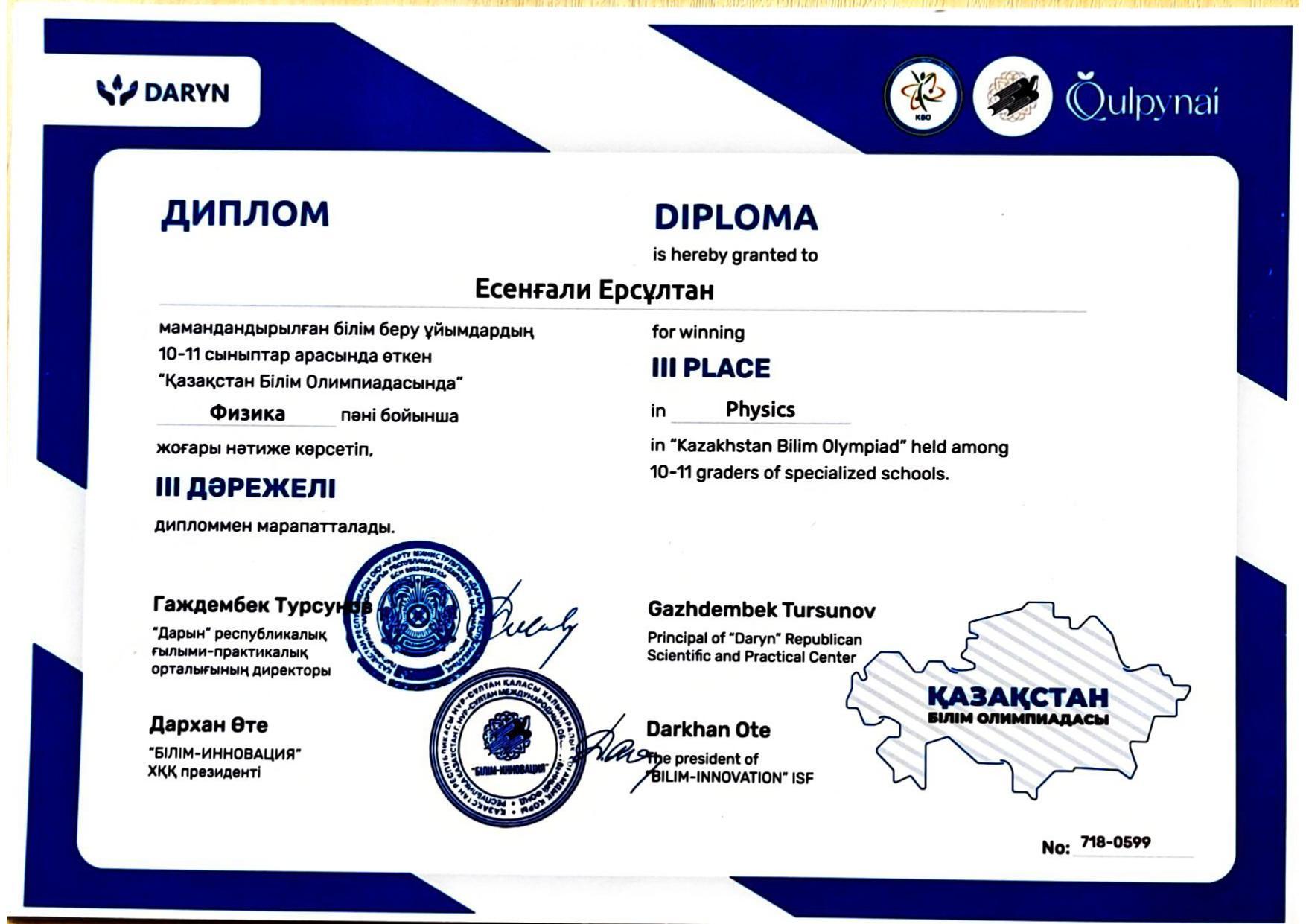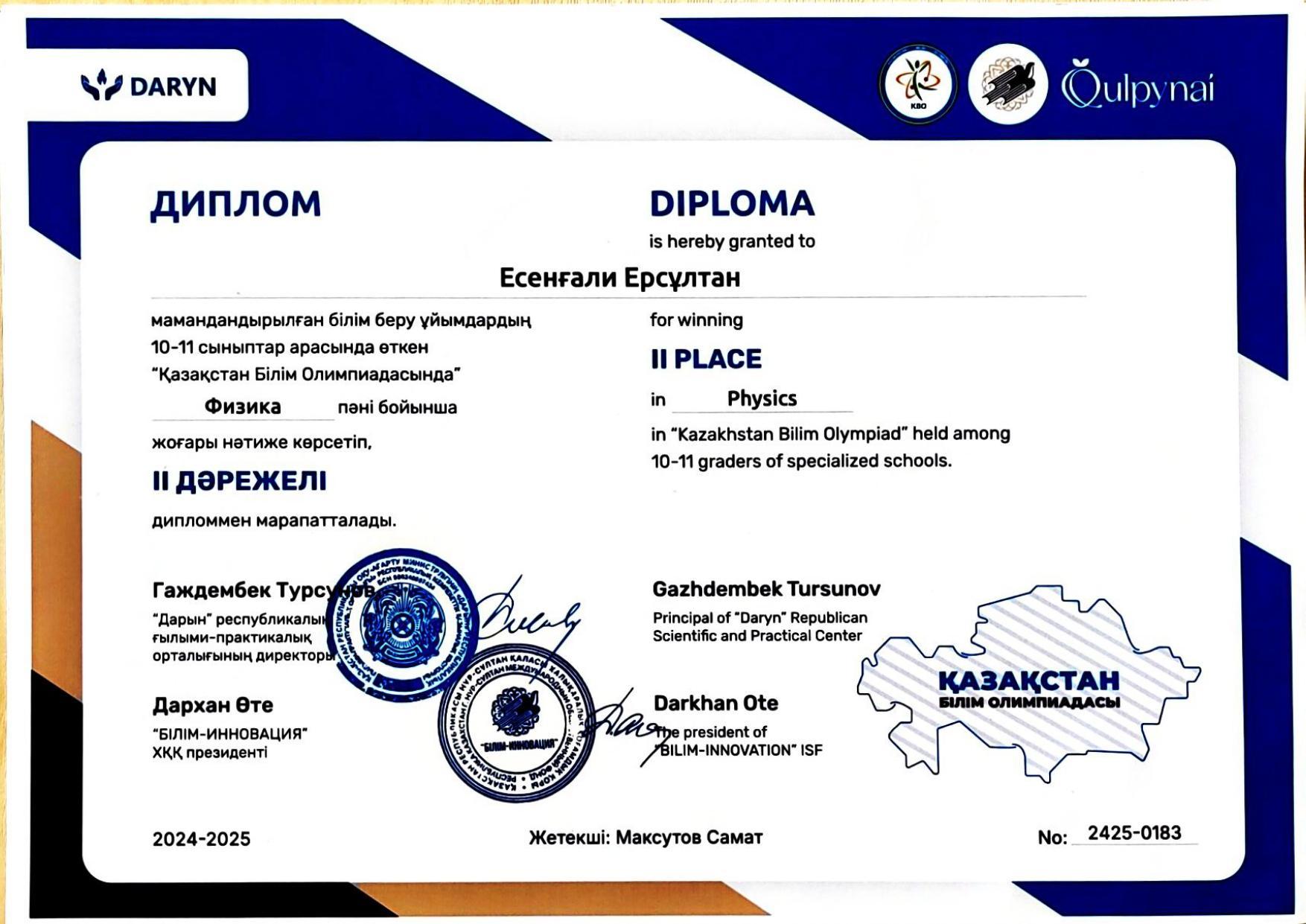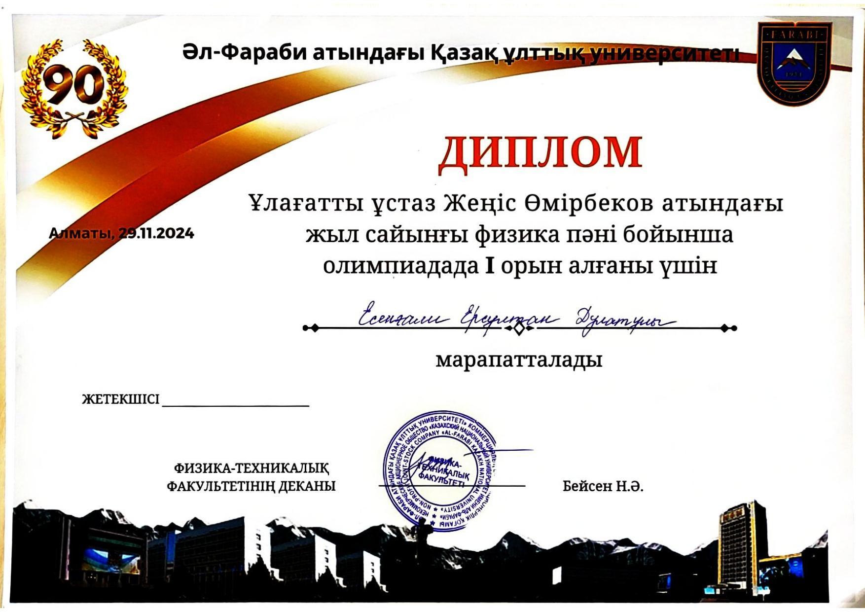 ✅ 29 қарашада Әл-Фараби атындағы ҚазҰУ физика- техникалық факультетінің ұйымдастыруымен өткен Өмірбек Жолдасбеков атындағы жыл сайынғы Республикалық физика пәні бойынша олимпиадада 1 дәрежелі дипломға ие болды;