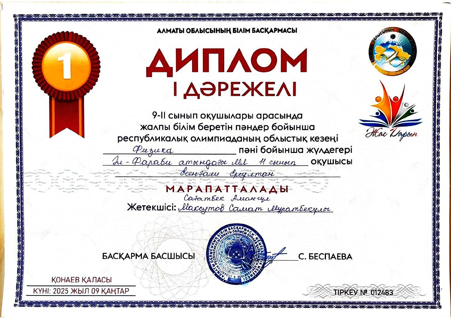 ✅ 6-8 қаңтар күндері Жалпы білім беретін пәндер бойынша 9-11 сынып оқушыларына арналған республикалық олимпиаданың облыстық кезеңінде І дәрежелі дипломмен марапатталды.