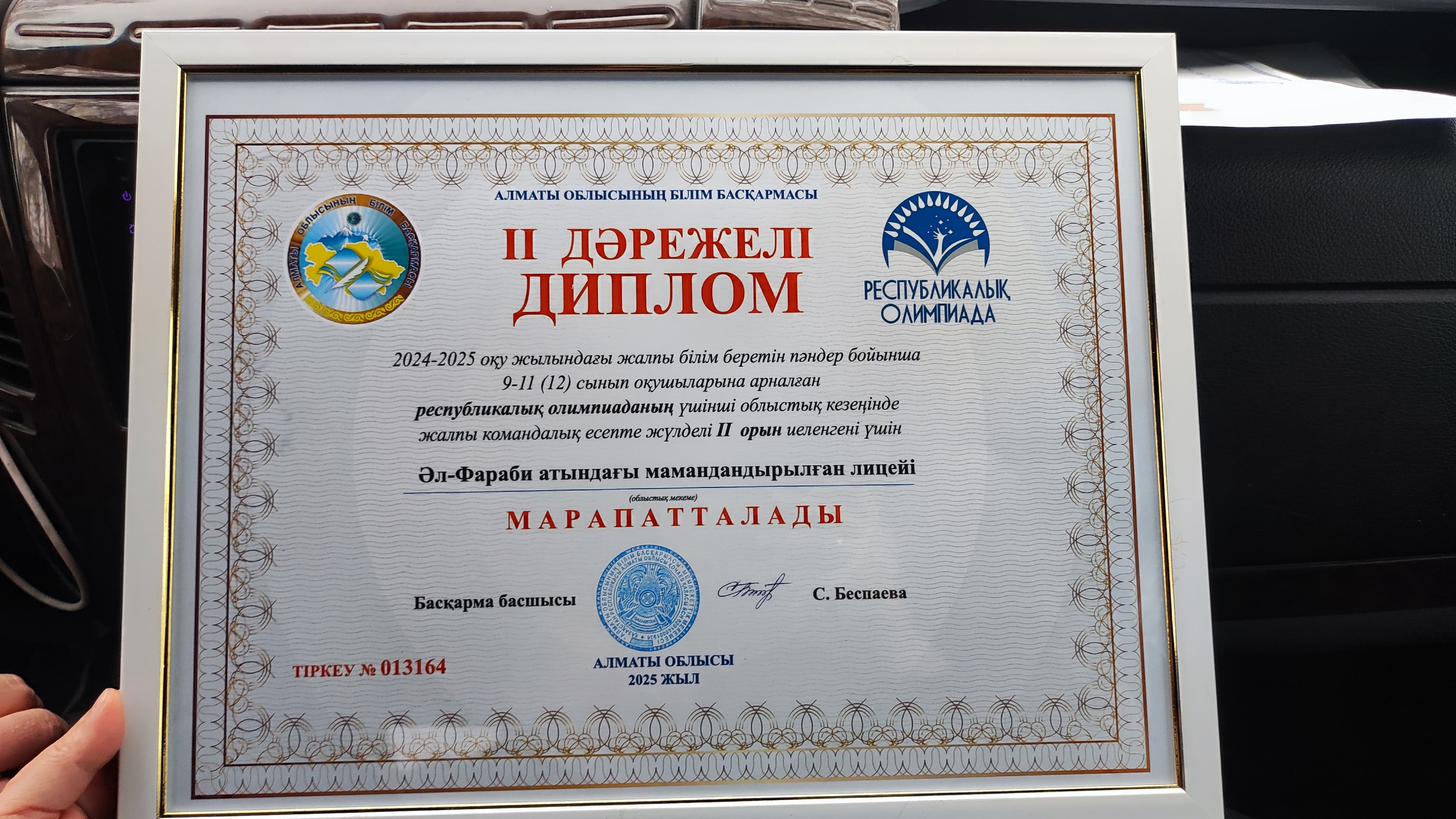 🔹Облыстық олимпиада нәтижесін сараптай келе, мамандандырылған лицейлер арасында командалық есепте Әл-Фараби атындағы мамандандырылған лицейінің "Фараби дарыны" командасы ІІ дәрежелі дипломмен марапатталды.