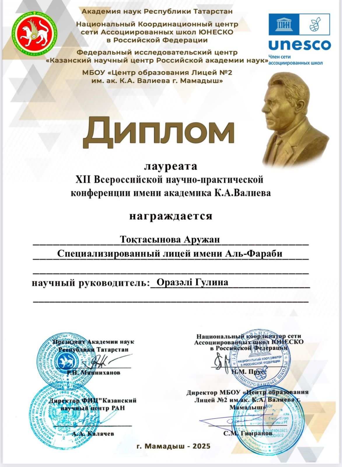 🔹Татарстан республикасы Мамадыш қаласында өткен К.Валиев атындағы ХІІ Бүкілресейлік ғылыми-практикалық конференцияда онлайн трансляция арқылы қатысып, ІІІ дәрежелі дипломға ие болған Әл-Фараби атындағы мамандандырылған лицейінің 9Ә сынып оқушылары Сейдулла Аяулым мен Тоқтасынова Аружанды, жетекшілері Оразәлі Гулина апайымызды шын жүректен құттықтаймыз!!!!