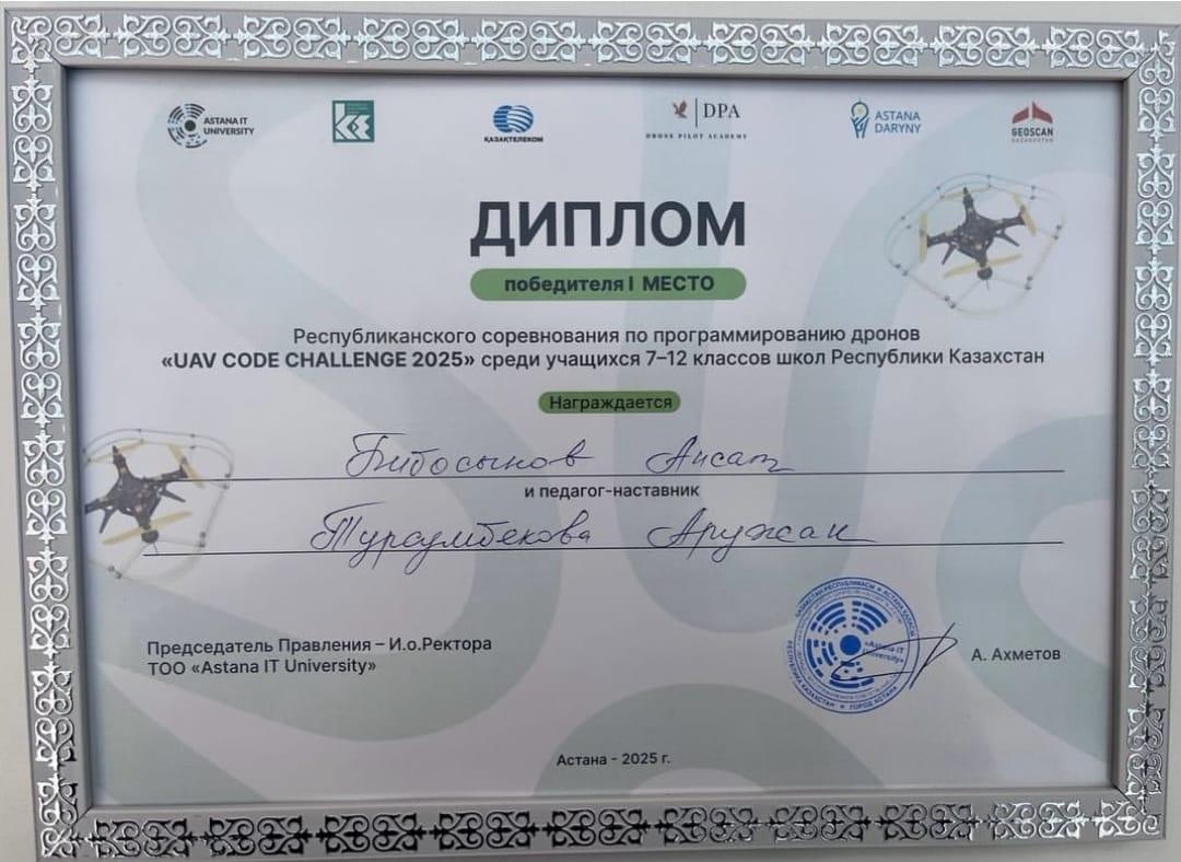 9-10 қазан күндері Астана қаласында Astana IT University-нің ұйымдастыруымен өткен Дрондарды бағдарламалау бойынша республикалық конкурсында Әл-Фараби атындағы мамандандырылған лицейінің 11А сынып оқушысы Бибосынов Ансат және информатика пәнінің мұғалімі Турсумбекова Аружан жеңімпаз атанып, І дәрежелі диплом және "BAS операторы" оқыту курсының сертификаттары иегерлері атанды!Құттықтаймыз!