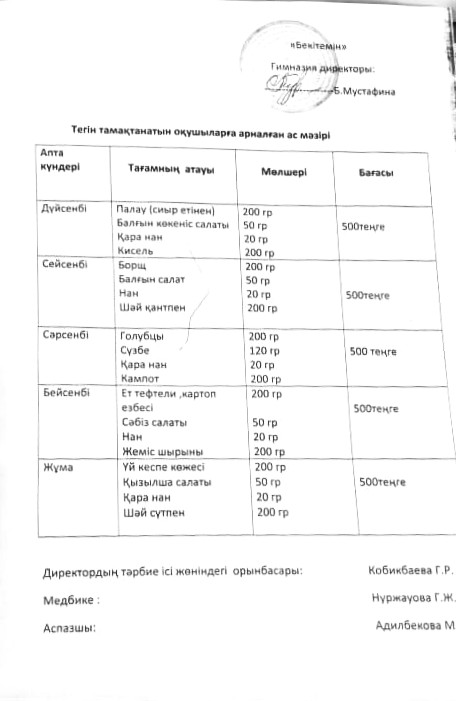» Тегін тамақтанатын оқушыларға арналған ас мәзірі