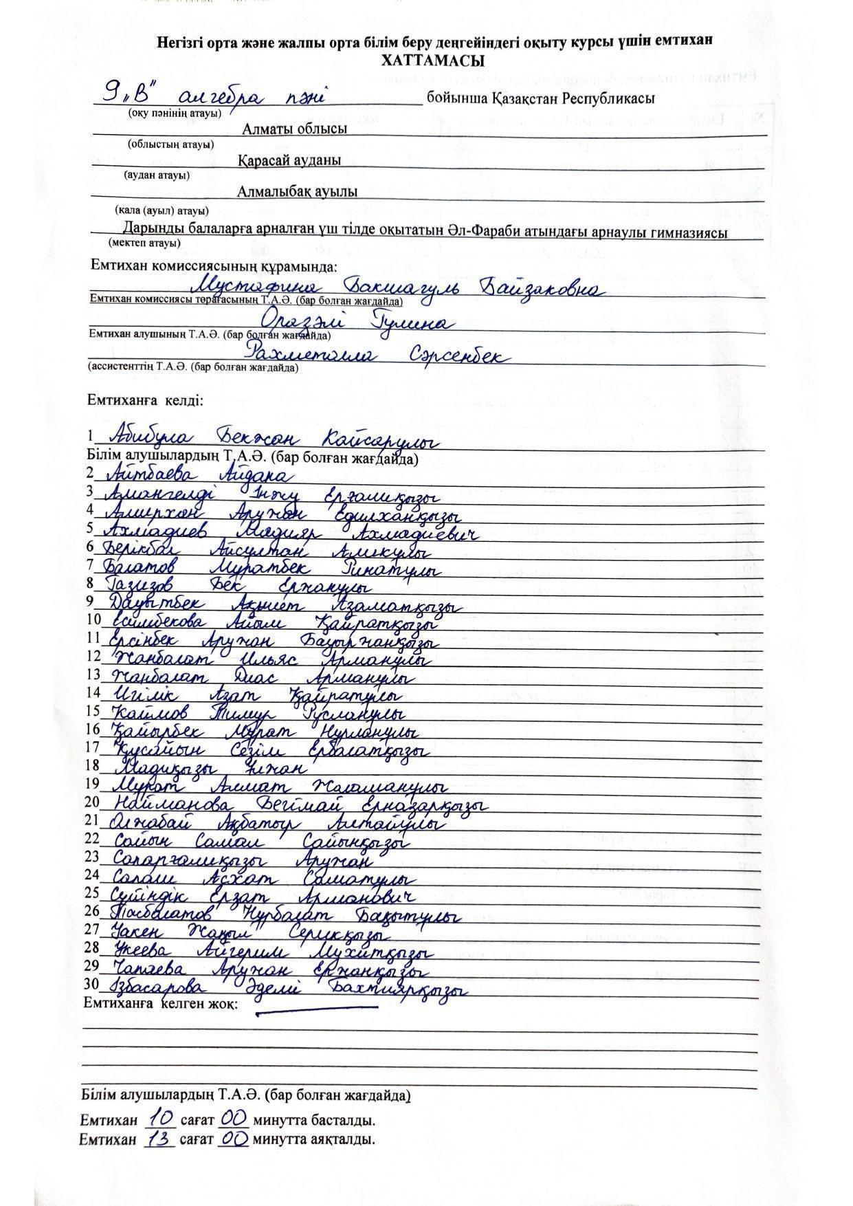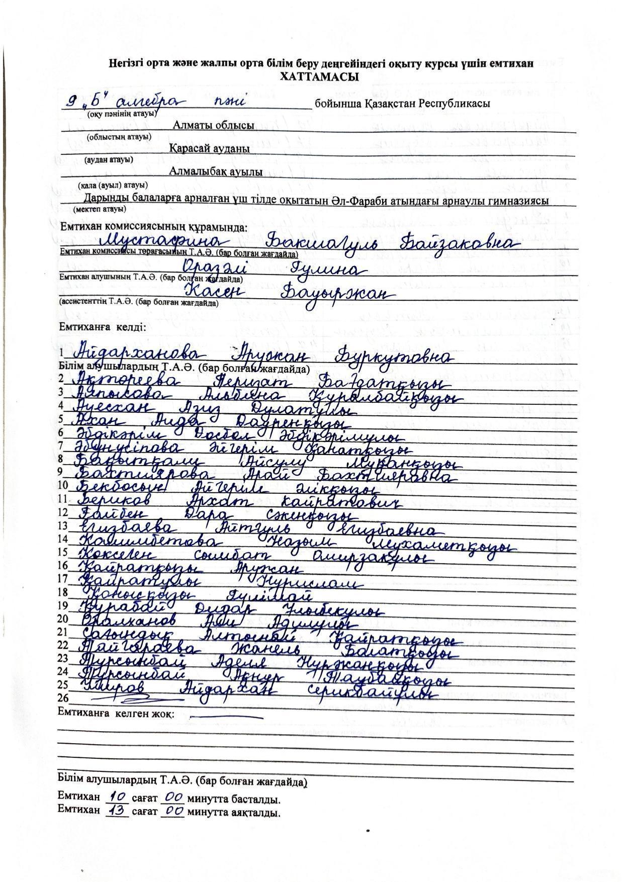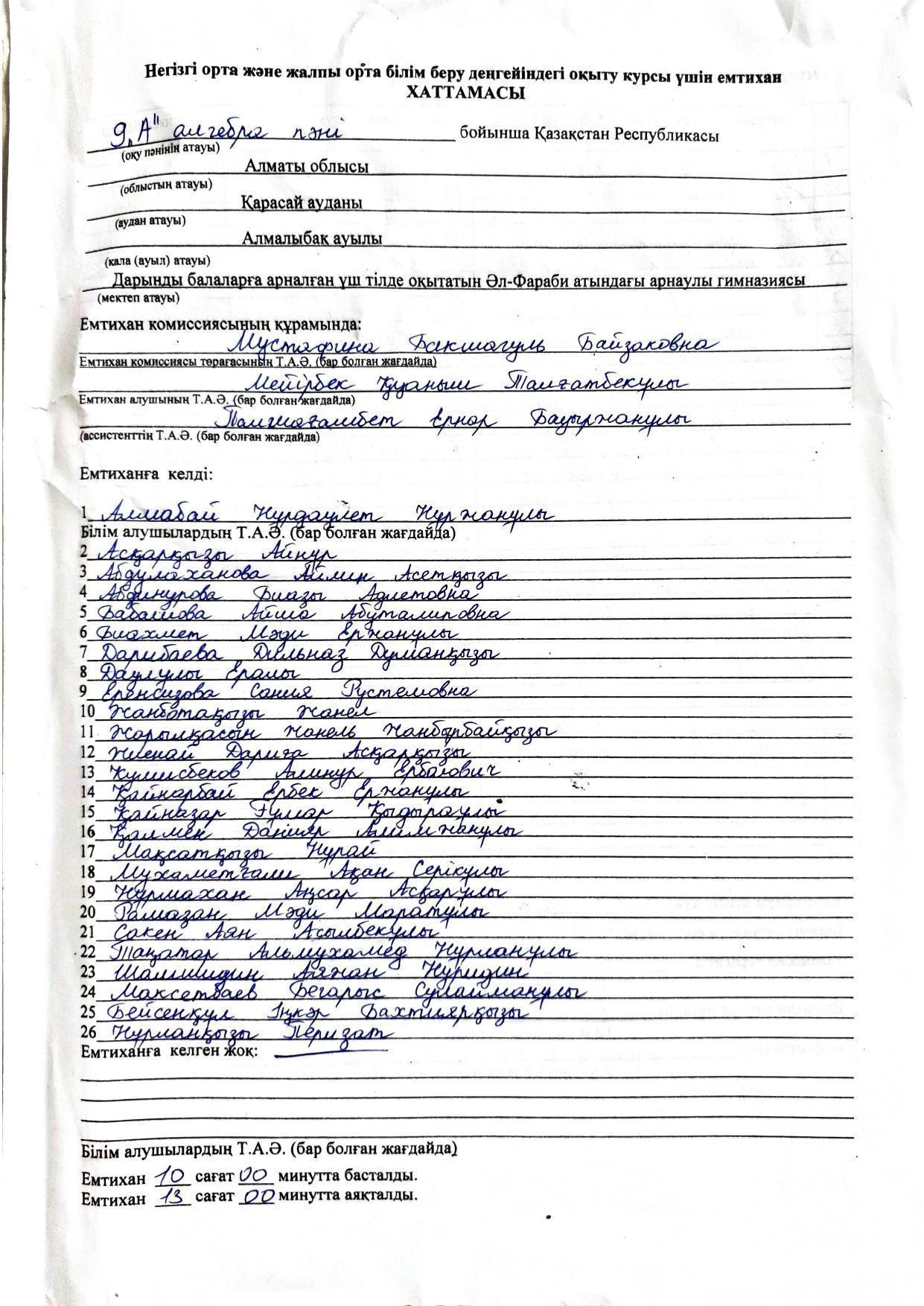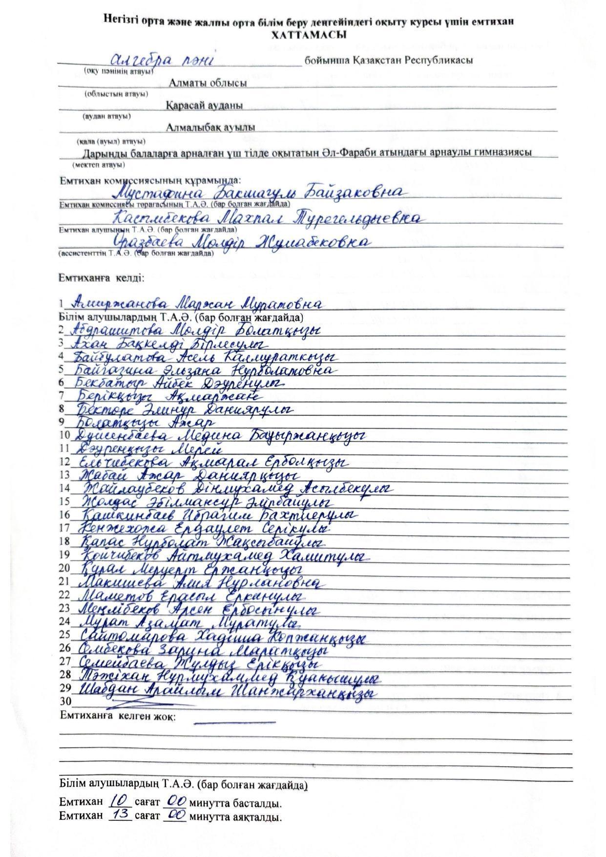 Қорытынды бітіру емтихандарының хаттамасы 2021-2022. Алгебра