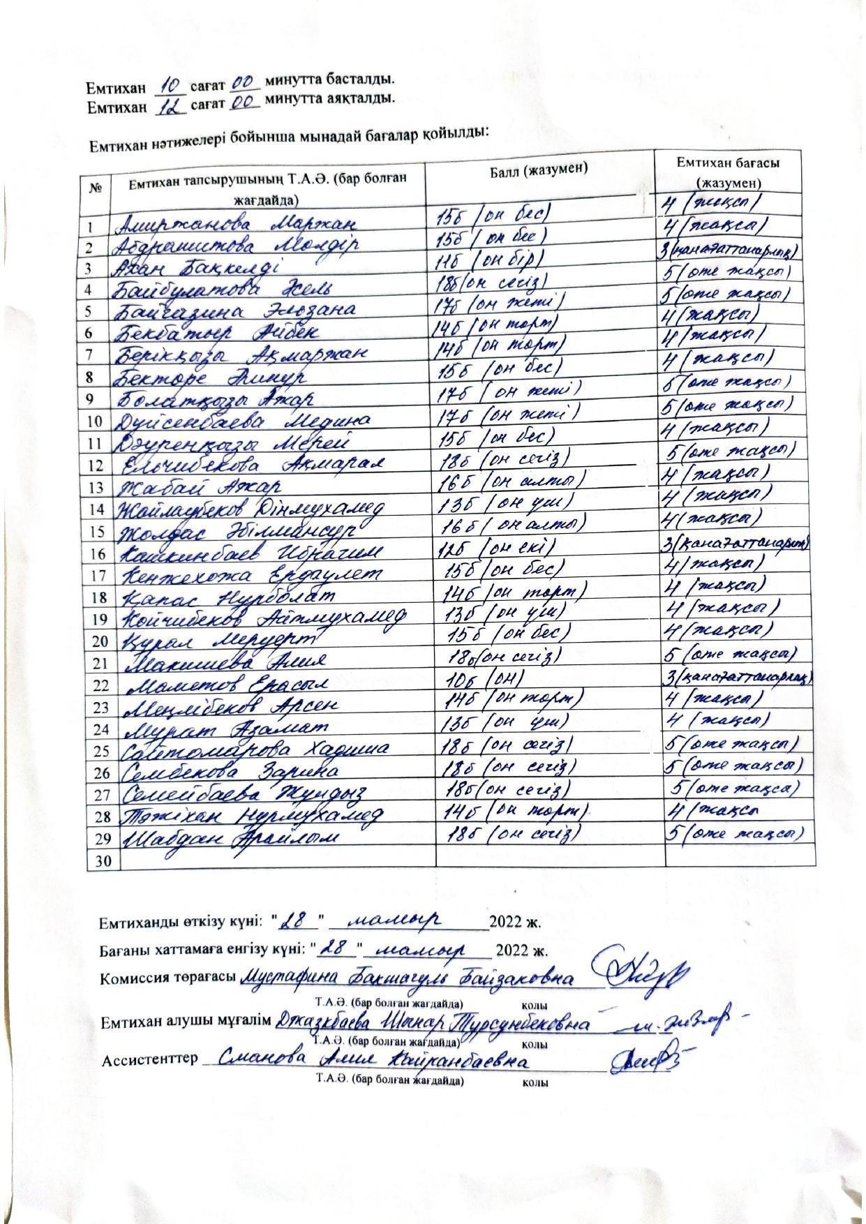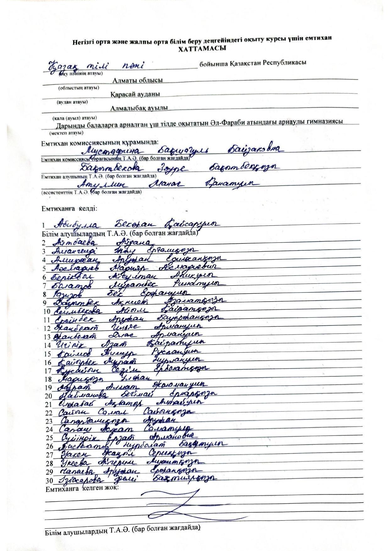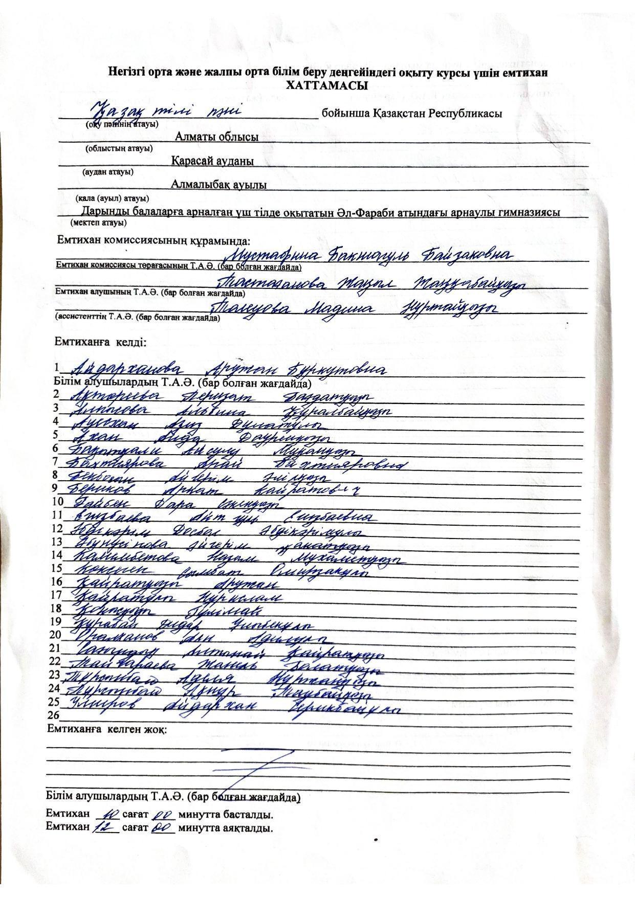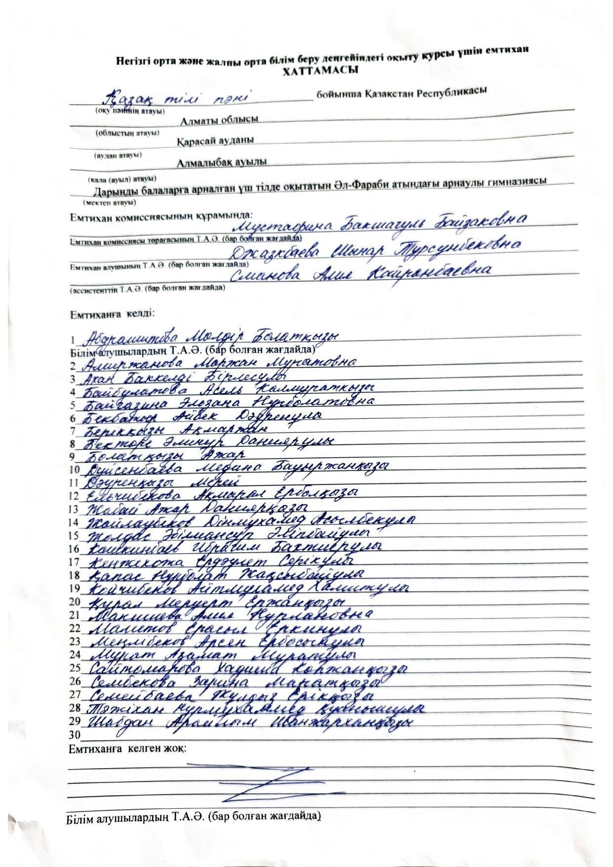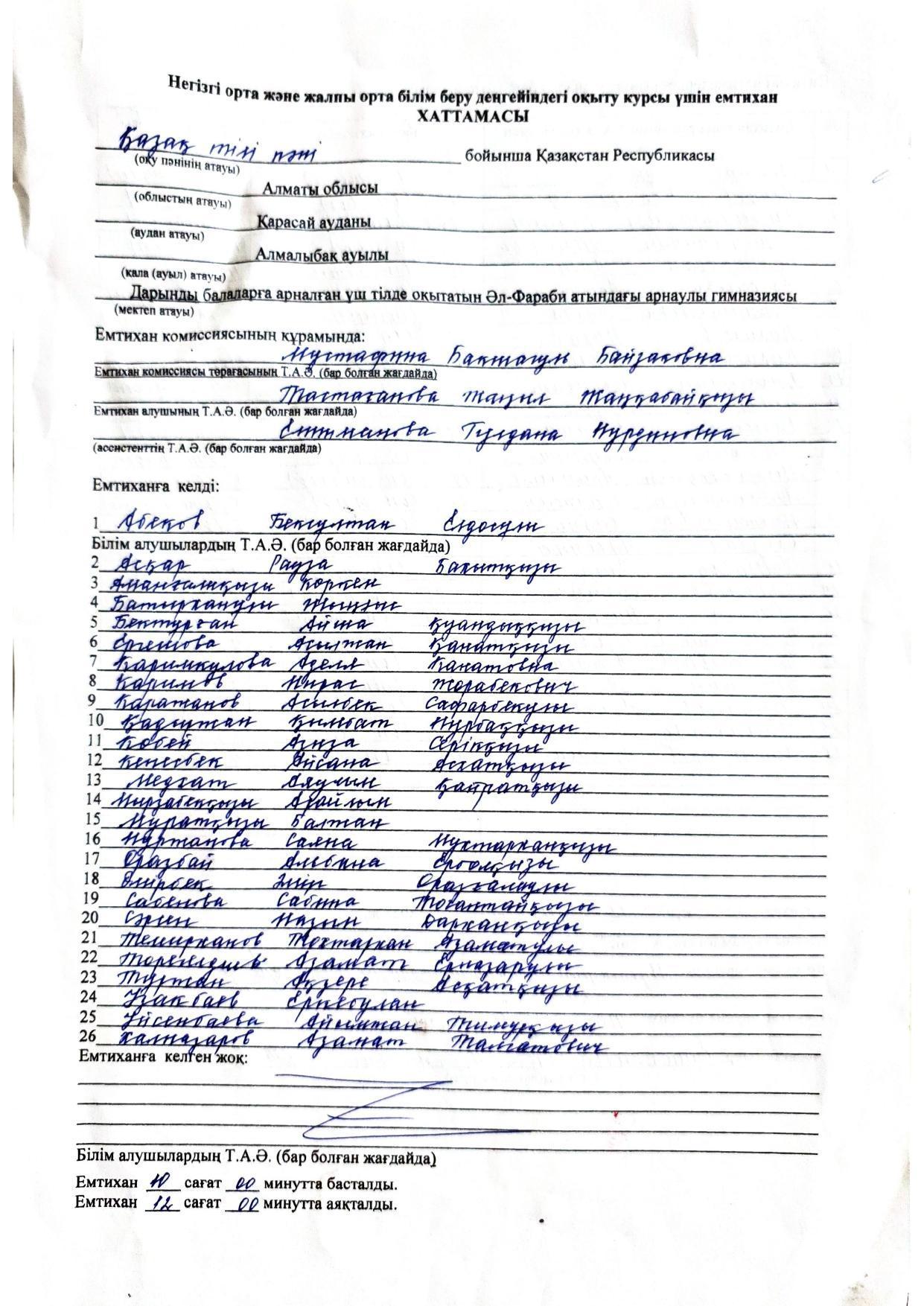 Қорытынды аттестаттау. Қазақ тілінен емтихан хаттамалары