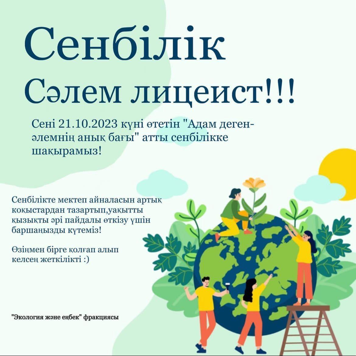 21 октябрь 2023 0 1 2 3 4 5 Сенбілік “Экология және еңбек” фракциясының ұйымдастыруымен “Адам деген - әлемнің анық бағы” атты сенбілік өтті.